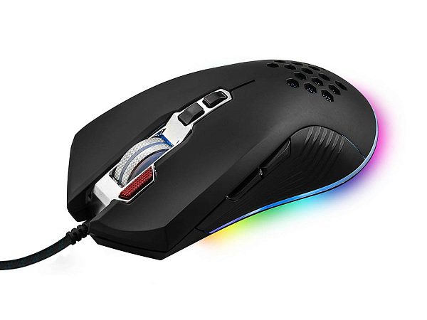 Мышь выполнена в корпусе из пластика черного цвета. Сверху и с боков расположены кнопки управления, также сверху находятся отверстия в виде сот. В нижней части аксессуара спрятаны RGB-светодиоды, которые отвечают за подсветку. Мышь подключается к компьютеру кабелем длиной 170 сантиметров. Вес аксессуара составляет всего 145 грамм.